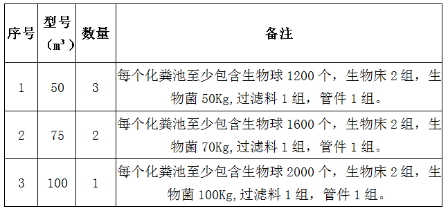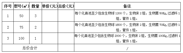 金松·尚含绿城化粪池采购工作。主要包括50m³化粪池3座、75m³化粪池2座、100m³化粪池1座。具体参数要求如下表: