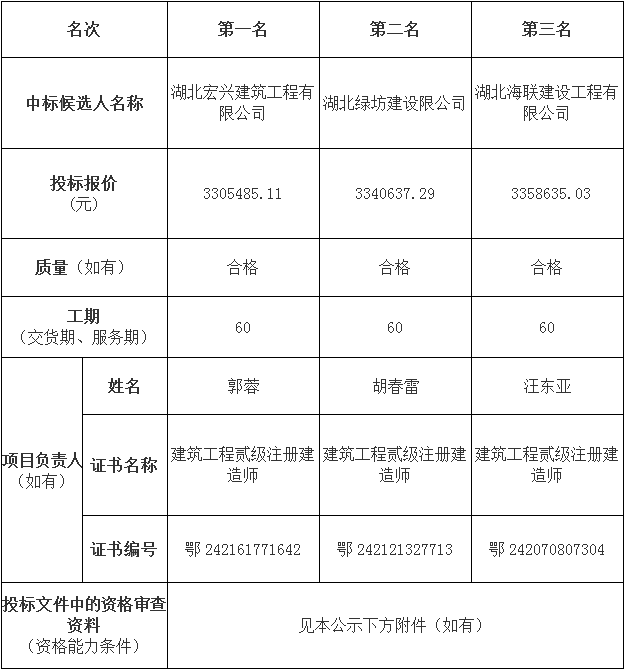 松滋金投永鑫胜商贸有限公司生活超市划子嘴店建设项目松滋金投永鑫胜商贸有限公司生活超市划子嘴店建设项目于2023年07月05日在湖北省电子招投标交易平台发布招标公告,2023年07月26日在松滋市开标室(2)开标,并于2023年07月26日完成评标工作。根据评标委员会提交的评标报告,松滋金投永鑫胜商贸有限公司已经确认评标结果,现进行评标结果公示。
