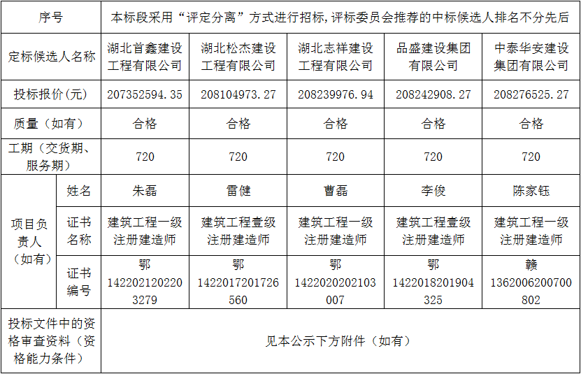 金投•新城臻品建设项目主体及配套工程于2023年09月06日在湖北省电子招投标交易平台发布招标公告,2023年09月28日在松滋市开标室(2)开标,并于2023年09月28日完成评标工作。根据评标委员会提交的评标报告,湖北松滋金投置业有限公司已经确认评标结果,现进行评标结果公示。