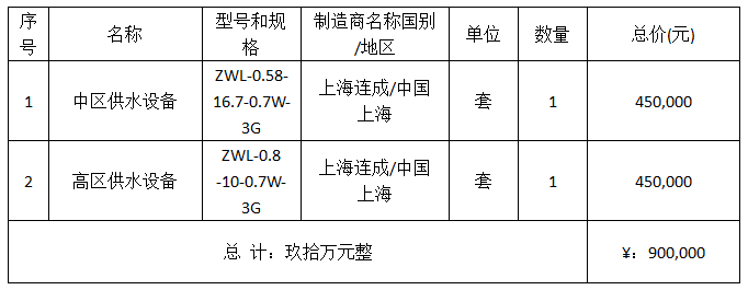 受湖北松滋金投置业有限公司的委托,湖北中兴方和工程咨询有限公司于2019年11月11日对湖北松滋金投置业有限公司金投•奥体庄园项目无负压供水设备项目采用竞争性磋商方式进行采购,现将本次采购的成交结果公告如下:
